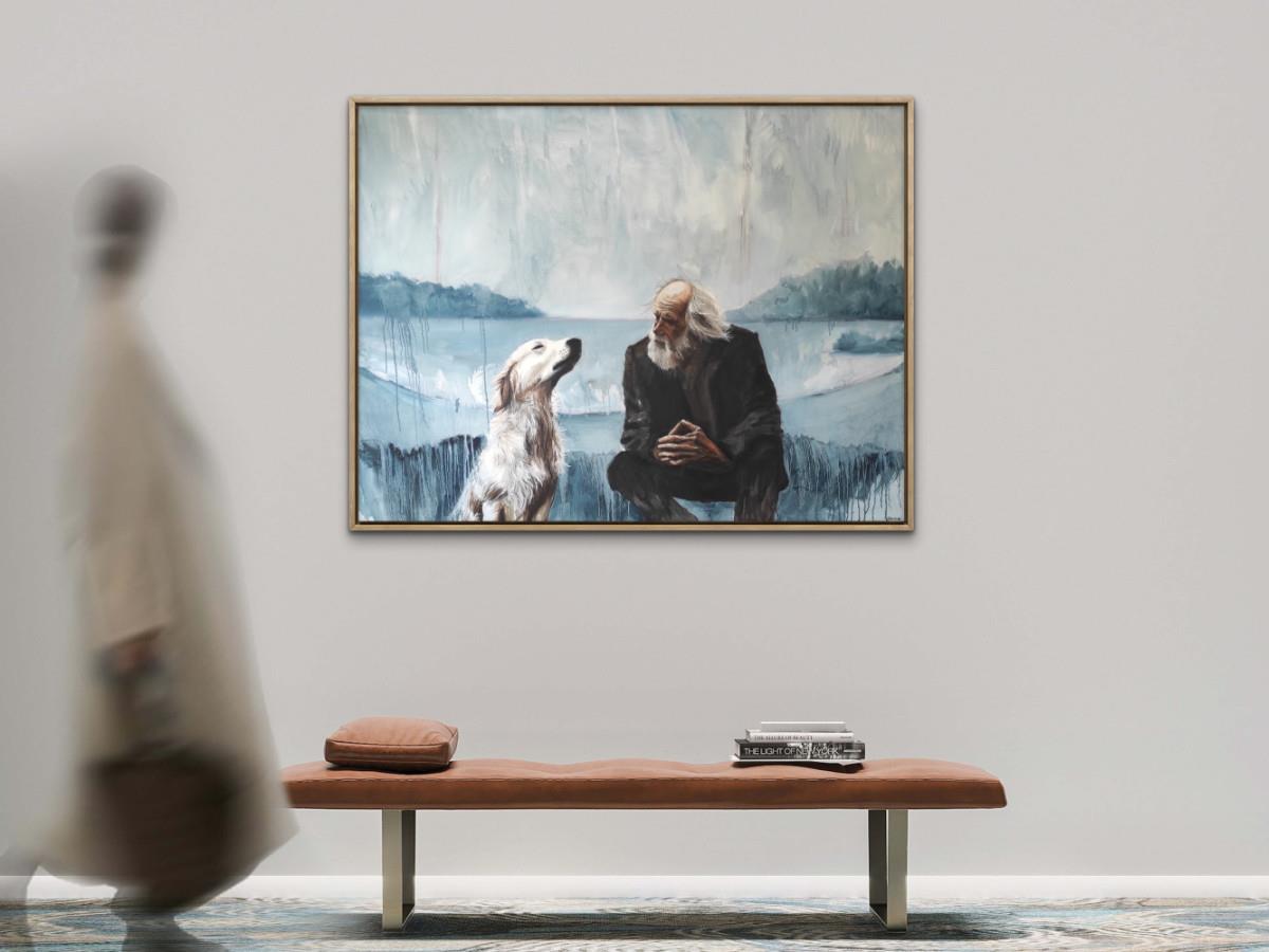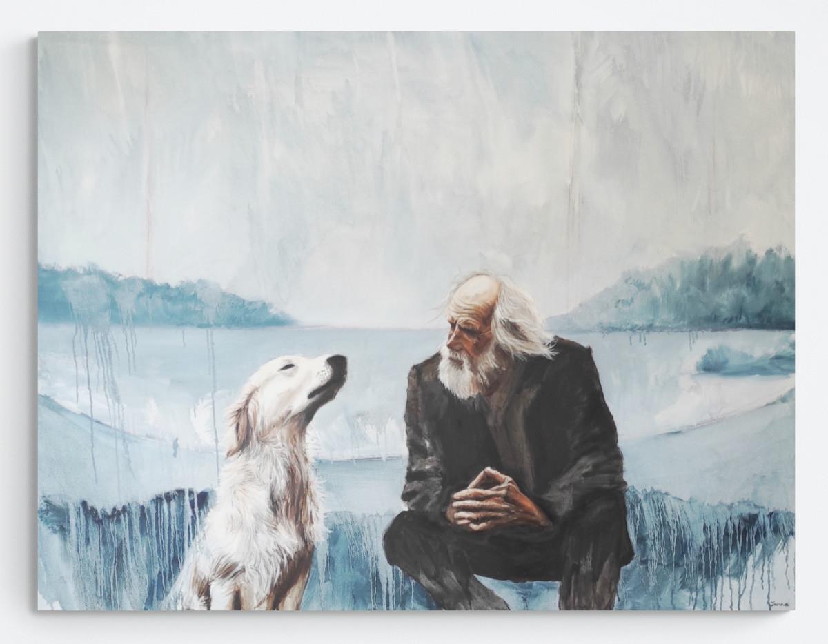 I loved this image so much for so many reasons, that I decided to paint it. To me this painting more depicts a feeling than anything else. A feeling of companionship. A sense of ageing, and with that life experience, and wisdom. A sense of having experienced so much, that a very deep depth of soul has formed. Yet this is not only felt and experienced, but shared. There is a strong sense of sharing in this image. And maybe it’s the very fact that life is shared that gives it more value, meaning, or joy? The dog’s expression speaks of absolute contentment, but also conveys some sense of honour, loyalty, and royalty.