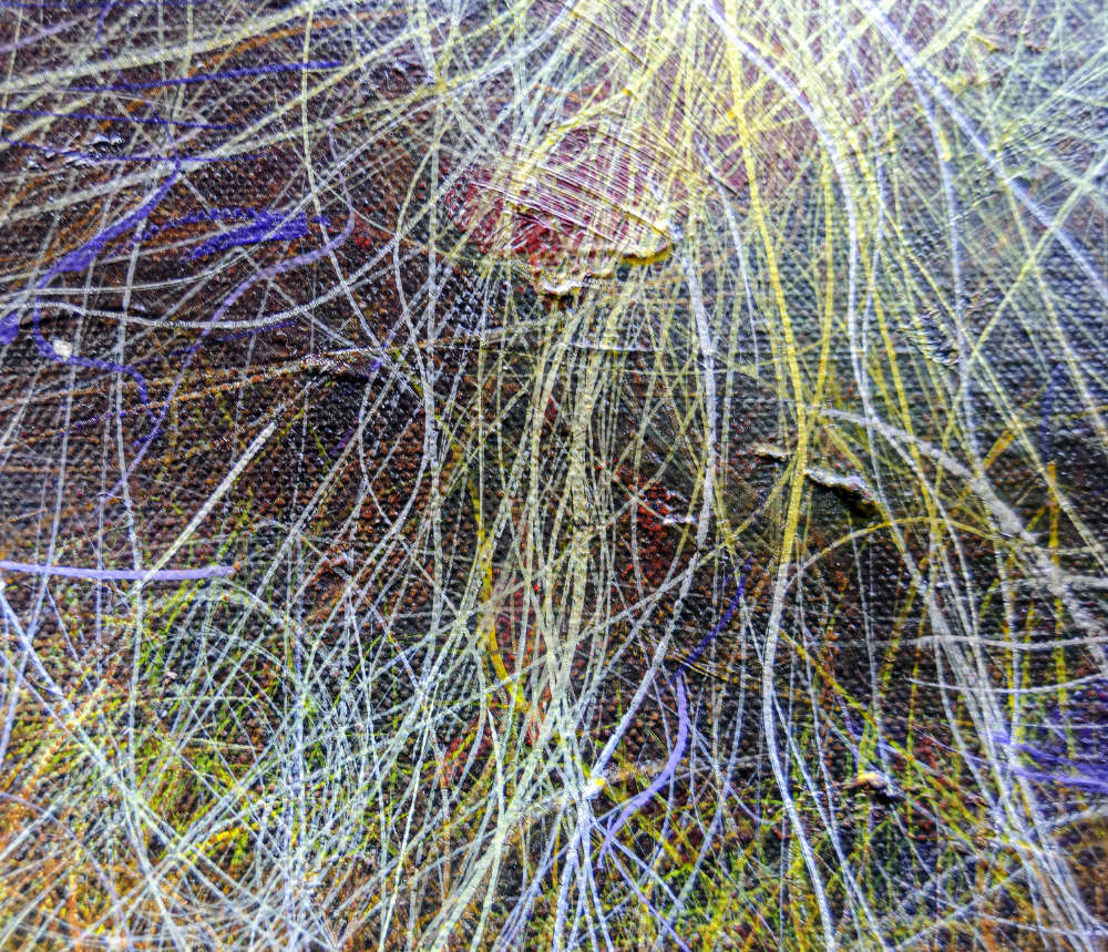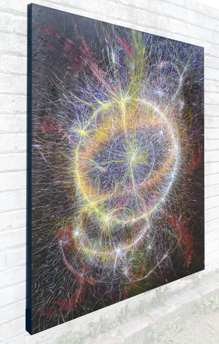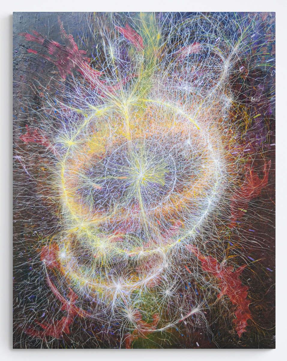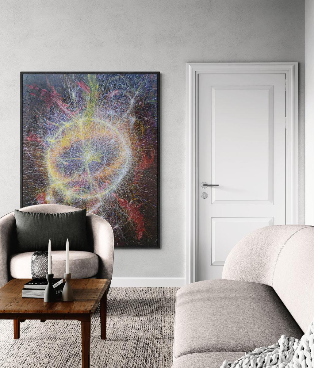 The painting emerges from an ongoing exploration of transformation: how order arises from chaos, and how every luminous centre carries within it the inevitability of fragmentation."